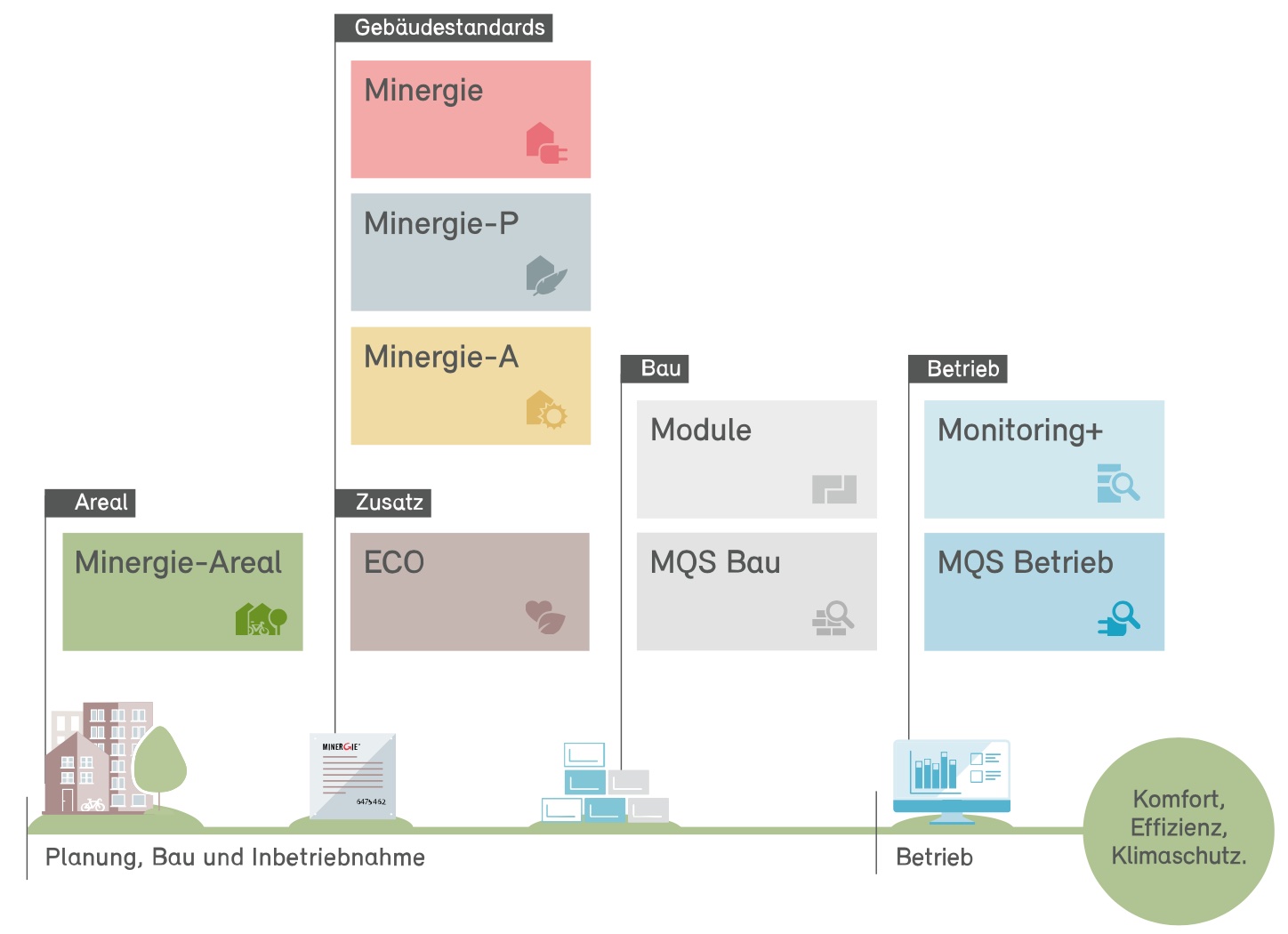 Die drei bekannten Baustandards Minergie, Minergie-P und Minergie-A stellen bereits in der Planungsphase höchste Qualität und Effizienz sicher. Ergänzt werden sie durch drei frei kombinierbare Zusatzprodukte: ECO berücksichtigt die Themen Gesundheit und Bauökologie. MQS Bau richtet sich an Bauherren und Planende, welche die anspruchsvollen Vorgaben am Bau garantiert haben möchten. MQS Betrieb optimiert die Nutzung der haustechnischen Anlagen und gewährleistet dadurch einen maximalen Komfort.